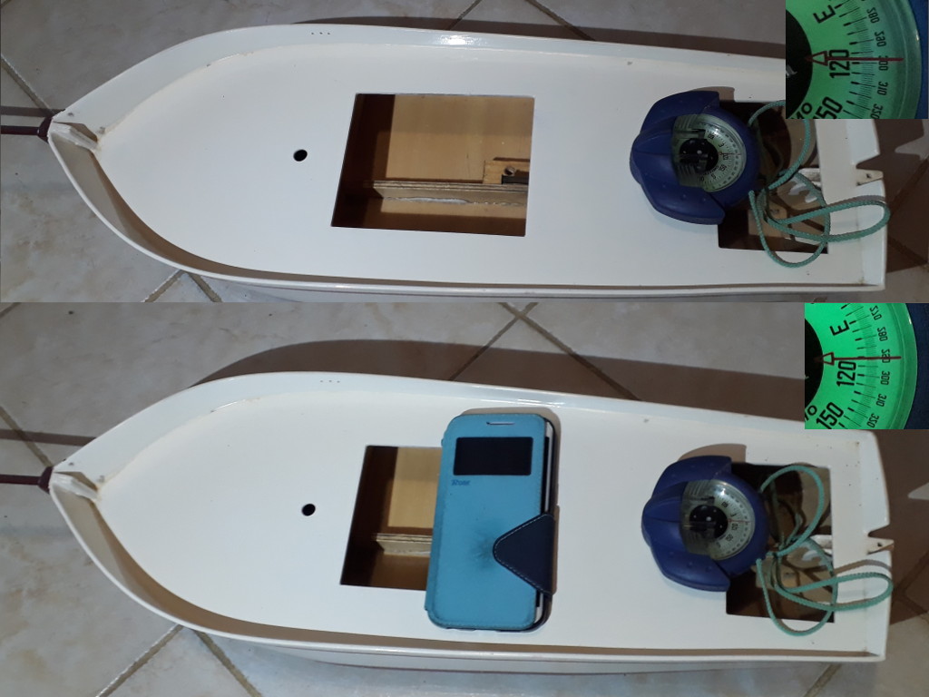 Abb. 1 zeigt im Experiment wie sich das Schiffsmagnetfeld auswirkt. In der oberen Bildhälfte zeigt der Kompass das Erdmagnetfeld mit 118° an. In der unteren Bildhälfte wird ein Schiffsmagnetfeld simuliert (Der Verschluss der Schutzhülle des Mobiltelefons ist magnetisch.). Der Kompass zeigt nun 111° an, also um 7° falsch. Somit ergibt sich bei einem Kurs von 111° eine Deviation von 7°.